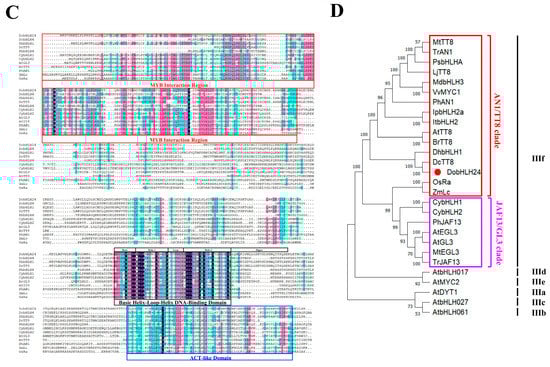 The ORF of DobHLH24 was 1989 bp encoding 412 amino acids. There was a typical bHLH conservative region in the N-terminal region of the DobHLH24 protein, and a character sequence that can interact with MYB was also found in this region (Figure 2C). Phylogenetic analysis showed that the protein most closely related to DobHLH24 was DcTT8, which was also closely related to DhbHLH1 (Figure 2D).