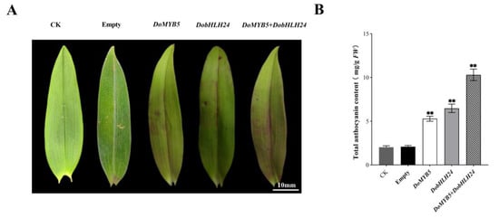 To further demonstrate the function of DoMYB5 and DobHLH24 in D. officinale, A. tumefaciens strain EHA105 harboring the recombinant plasmids of 35S::DoMYB5 and 35S::DobHLH24 were separately or simultaneously injected into the leaf of D. officinale. The overexpression of DoMYB5 and DobHLH24 in green varieties promoted the accumulation of anthocyanins. Significantly higher levels of anthocyanins were accumulated in the leaves overexpressing DoMYB5 and DobHLH24 compared with the control (Figure 3A,B). DoMYB5 and DobHLH24 were noticeably involved in regulating the accumulation of anthocyanins in D. officinale.