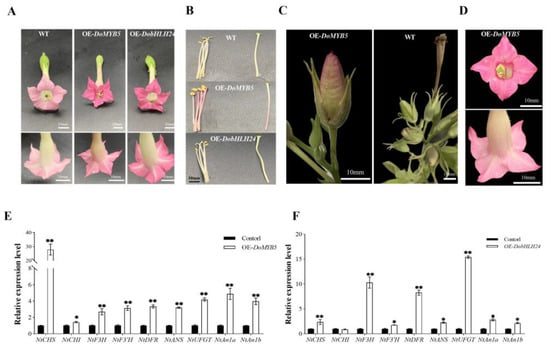 Phenotypic and relative expression levels of anthocyanin pathway genes of transgenic tobacco flowers overexpressing DoMYB5 and DobHLH24. (A) Flowers of overexpressing DoMYB5 and DobHLH24 lines. (B) Stamens and pistil of overexpressing DoMYB5 and DobHLH24 lines. (C) Fruit of WT and overexpressing DoMYB5 lines. (D) Overexpressing DoMYB5 plants have a petal reduction phenotype. (E,F) Relative expression levels of anthocyanin pathway genes in flowers of transgenic tobacco lines carrying DoMYB5(E) and DobHLH24. (F). * Significant difference (p < 0.05). ** Extremely significant difference (p < 0.01).