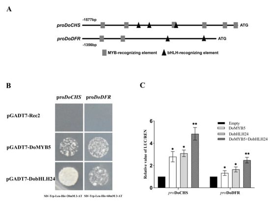 DoMYB5 and DobHLH24 activate the promoters of DoCHS and DoDFR. (A) Pattern diagram of the promoters of DoCHS and DoDFR. Triangles, bHLH-recognizing elements; rectangles, MYB-recognizing elements. (B) DoMYB5 and DobHLH24 bound directly to the promoters of DoCHS and DoDFR in yeast one-hybrid assays. (C) DoMYB5 and DobHLH24 activate the promoters of DoCHS and DoDFR in dual-luciferase assays. pro: promoter. * Significant difference (p < 0.05). ** Extremely significant difference (p < 0.01).