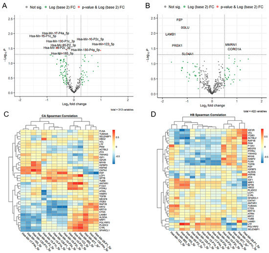 Proteomic data. (A,B) Volcano plot of differentially expressed miRNAs (A) and proteins (B) in CA vs. HB. A total of 15 miRNAs and seven proteins were differentially expressed. (C,D) Heatmap of Spearman correlation coefficients between miRNAs and targeted proteins in CA (C) and HB (D).
