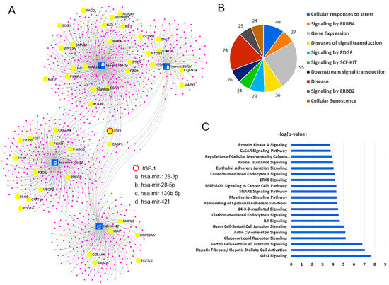 The four potential miRNA biomarkers (hsa-mir-28-5p, hsa-mir-128-3p, hsa-mir-130b-5p, and hsa-mir-421) that were able to discriminate CA from HB were subjected to pathway and network analyses. These four miRNAs targeted 1162 genes, and the Pathways in Cancer was the most significantly enriched KEGG pathway (adj p-value < 0.001) with 45 target genes (Figure 3A). IGF-1, which is known to promote cancer cell growth and proliferation, was targeted by all four miRNAs in the miRNA-target network (Figure 3A). Reactome analysis was conducted to determine the roles of the target genes. The top 10 statistically significant (adj p-value < 0.01) groups included Cellular responses to stress (40 genes), Signaling by ERBB4 (27 genes), Gene Expression (95 genes), Diseases of signal transduction (36 genes), Signaling by PDGF (29 genes), Signaling by SCF-KIT (24 genes), Downstream signal transduction (26 genes), Disease (74 genes), Signaling by ERBB2 (25 genes), and Cellular Senescence (24 genes) (Figure 3B). Interestingly, IPA within the proteomic study also showed that the IGF-1 signaling pathway was most significantly enriched in CA vs. HB (Figure 3C), which was consistent with the results of miRNA network analysis.