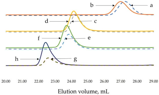 SEC chromatograms of initial PEGs (dashed line) and modified PEGs (solid line) in tetrahydrofuran (THF). (a) PEG 1 kDa; (b) PEG-m 1 kDa; (c) PEG 5 kDa; (d) PEG-m 5 kDa; (e) PEG 6 kDa; (f) PEG-m 6 kDa; (g) PEG 10 kDa; and (h) PEG-m 10 kDa.