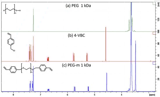 1H NMR spectra of (a) PEG 1k; (b) 4-VBC; and (c) PEG-m 1k. Analyses were performed in CDCl3.