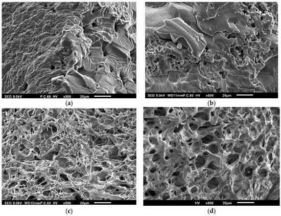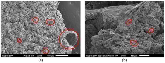 The surface morphology of synthesized hydrogels was investigated via scanning electron microscopy (SEM). Samples were swollen in water and then cryofractured to reveal their inner structures. Hydrogels prepared with PEG-m 1k with no crosslinker (Figure 3a) and hydrogels prepared with PEG-m 1k/cellobiose-m (Figure 3b) have remarkably similar morphologies, implying that the addition of cellobiose-m does not substantially affect the segment arrangement of the resulting network. Gels prepared with PEG-m 6k and PEG-m 6k/cellobiose-m have interconnected porous structures and are also visually similar (Figure 3c,d). Micrographs of hydrogels prepared with PEG-m 1k and PEG-m 6k using 1 wt% cellulose Sigmacell (Figure 4a and Figure 4b, respectively) reveal that cellulose fibers (encircled in red) are embedded into the hydrogel network and are visible on the micrographs upon cryofracturing.
