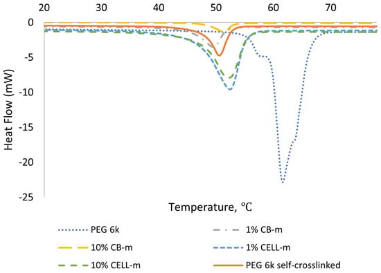 The mobility of PEG segments within the network was investigated via differential scanning calorimetry (DSC). Melting transitions of hydrogels prepared with PEG-m 6k are shown in Figure 5. Typically, PEG chains in the crystal lattice are arranged as lamellae, with the chains in either extended or folded forms. For PEG 6k, there can be up to two folds in a crystal; however, the second one reportedly cannot be observed via DSC []. The unmodified PEG has seemingly three crystal fractions, the largest one having a melting temperature (Tm) of 61.6 °C. The self-crosslinked PEG melts at 50.6 °C. Such results indicate that PEG chains, before modification, have more freedom to fold and form ordered crystals of different sizes that would require more energy to melt. On the other hand, PEG chains in the crosslinked sample are more restricted and undergo less chain folding (smaller crystals), so lamellae melt at lower temperatures. The measured degree of crystallinity (DC) is a good measure of the perfection of the crystals and their bulk content. PEGs are semicrystalline polymers, and depending on the sample preparation conditions and molecular mass, they may contain a portion of an amorphous fraction [,].