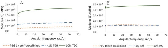 The structural integrity of a gel can be tested by standard rheological characterization. Properties such as “elastic modulus” (G′) and “viscous modulus” (G″) reveal the strength of a material []. Figure 6 and Figure 7 show the G’ and G” of hydrogels prepared with PEG 1k and 6k, respectively, crosslinked with modified cellulose T-90. Both G′ and G″ are strongly frequency independent, with G′ values larger than G″. These results indicate that all gels are “strong gels” that can store deformation energy over a broad frequency range due to their crosslinked structure [,]. Only Technocell-90-based hydrogels are shown here for simplicity, the rest of the data is presented on Figures S11–S14.