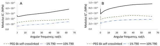 Frequency sweep of PEG-m 6k hydrogels, elastic (A) and viscous (B) moduli.