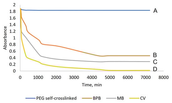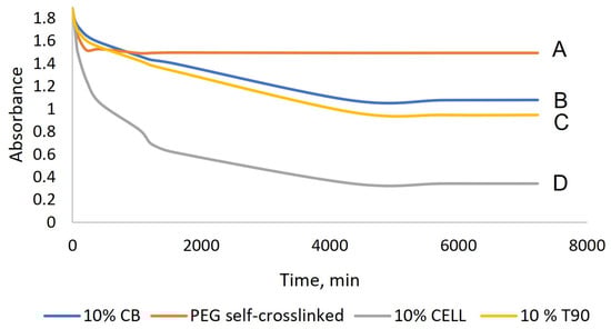 Comparison of organic dye adsorption by PEG-m 6k gels. (A) Self-crosslinked, BPB; (B) 10 w% CELL, BPB; (C) 10 w% CELL, MB; and (D) 10 w% CELL, CV. Absorbance was adjusted for the amount of hydrogel used.