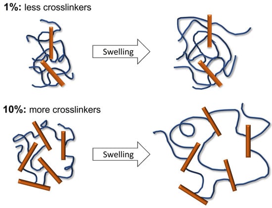 Hydrogel networks prepared with 1 and 10 wt% crosslinkers before and after swelling.