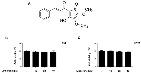 Linderone was isolated from the leaves of L. erythrocarpa Makino (see Figure 1A for chemical structure). To determine the cytotoxic effects of linderone, we treated HT22 and BV2 cells with various linderone concentrations, followed by a 3-(4,5-dimethylthiazol-2-yl)-2,5-diphenyltetrazolium bromide (MTT) assay. The results showed that 10–40 μM was a safe concentration range (Figure 1B,C). Thus, we set the maximum treatment concentration of linderone at 40 μM for subsequent experiments.