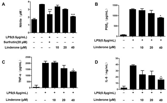 An LPS-induced BV2 cell was established for measuring nitrite production. We used sulfuretin (20 μM) as a positive control because its anti-inflammatory effect is excellent. The effect of linderone on nitrite levels was significant at 40 μM (Figure 2A). We demonstrated that prostaglandin E2 (PGE2) production was inhibited by linderone (Figure 2B). Linderone also inhibited IL-6 and TNF-α production (Figure 2C,D). Thus, linderone significantly reduced the level of inflammatory factors in LPS-induced BV2 cells.