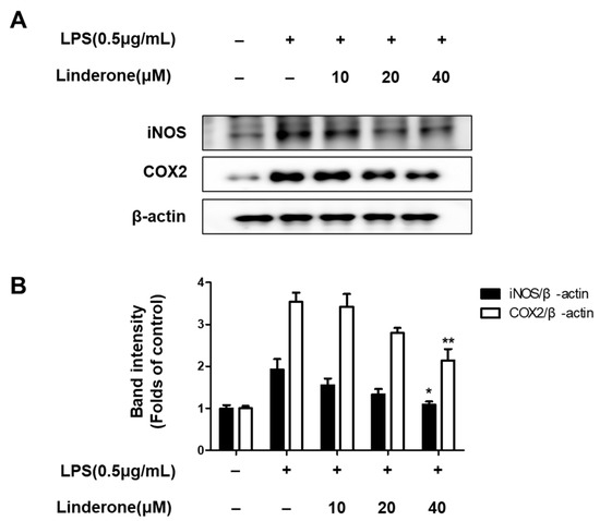 Expression of iNOS and COX-2 (A,B) in BV2 cells. Cells were pretreated for 2 h with linderone and cultured for 24 h with LPS. Band intensities were normalized to β-actin. * p < 0.05, ** p < 0.01 compared with LPS-treated group.