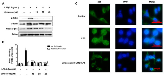 Effects of linderone on NF-κB (A,B) and p65 localization (C) in BV2 cells. Cells were pretreated with linderone for 2 h and cultured with LPS for 1 h. * p < 0.05, *** p < 0.001 compared with LPS-treated group.