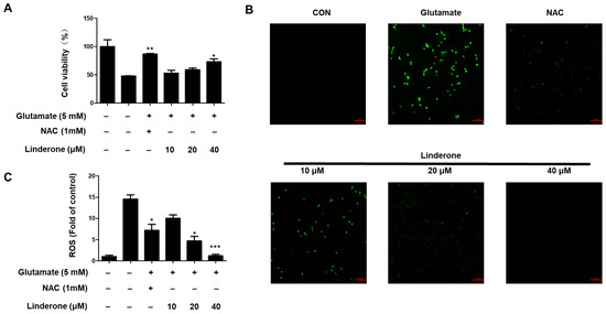 Neuroprotective effect of linderone on HT22 cells. After pretreated with linderone for 2 h, cell viability (A) was analyzed in the absence or presence of glutamate for 24 h; ROS generation (B) was detected using fluorescence microscope (original magnification: ×100); and fluorescence intensities were quantified using ImageJ software (C) * p < 0.05, ** p < 0.01, *** p < 0.001 compared with control group. N-acetyl-cysteine (NAC, 1 mM) was the positive control.