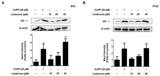 Effects of linderone on HO-1 expression in BV2 (A) and HT22 cells (B). Cells were treated with linderone or CoPP for 12 h. * p < 0.05, *** p < 0.001 compared with control group.