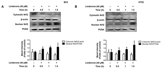 Effects of linderone on Nrf2 in BV2 (A) and HT22 cells (B). Cells were treated with linderone at different time points. * p < 0.05 compared with control group.