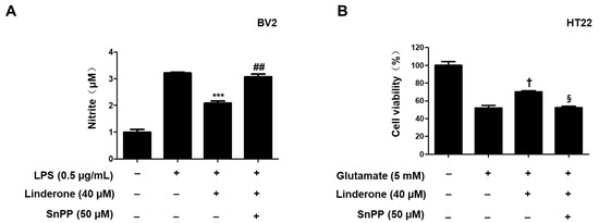 Inhibitory effects of linderone on nitrite production through regulating HO-1 activity in BV2 (A) and HT22 cells (B). Cells were pretreated with SnPP or linderone and then stimulated for 24 h with LPS or glutamate. *** p < 0.001 vs. LPS group. ## p < 0.01 vs. LPS and linderone group. † p < 0.05 compared with glutamate group. § p < 0.05 vs. glutamate and linderone group.
