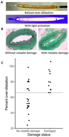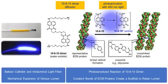 - Munger, K.A.; Downey, T.M.; Haberer, B.; Pohlson, K.; Marshall, L.L.; Utecht, R.E. A novel photochemical cross-linking technology to improve luminal gain, vessel compliance, and buckling post-angioplasty in porcine arteries. J. Biomed. Mater. Res. B Appl. Biomater. 2016, 104, 375–384. [Google Scholar] [CrossRef]