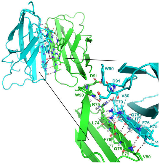 In addition, recent studies have shown that some amino acids on the surface of the irisin monomers specifically play vital roles in the formation of the dimer. In this context, R72 from C′-loop; L74, R75, F76, Q78, E79, and V80 from C′-strand; A88 and W90 from E-strand; and D91 from E-loop are the most important residues involved in the direct interaction between the two chains (Figure 2) [11,12].