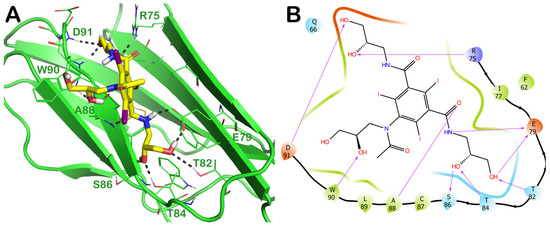 One of the most promising FDA-approved drugs selected by the mentioned computational protocol is represented by ZINC000003830946 (iohexol). Figure 3 shows the molecular docking output, highlighting the main contacts that this drug can establish with the surface of irisin dimers (Figure 3A). In particular, this compound was able to strongly target the irisin interface, establishing H bonds with R75, E79, T82, T84, S86, W90, and D91 (Figure 3B). As visible in the pictorial representation, this compound was able to occupy the whole surface involved in the irisin dimerization, and this could be helpful for disrupting the correct recognition of irisin monomers.