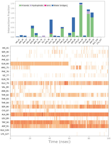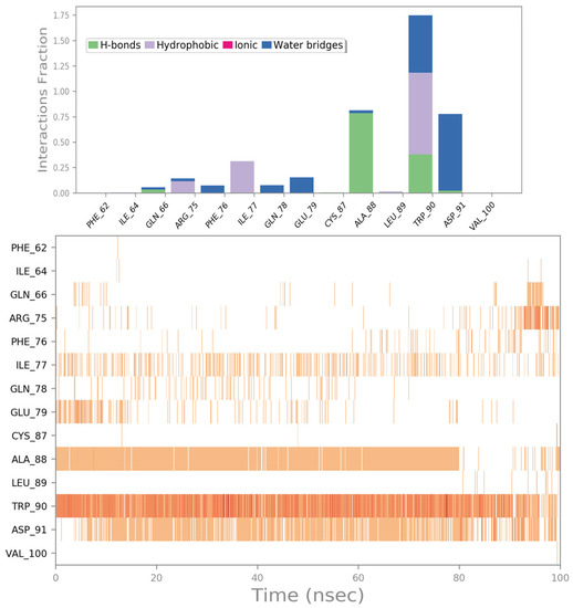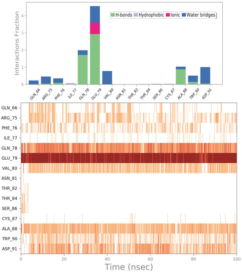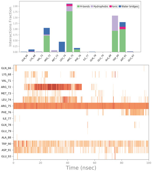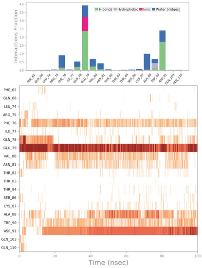 The MD simulation trajectory analysis for the compound ZINC000018043251 highlighted strong stability in targeting the retrieved binding site. In fact, the drug maintained the ability to target A88 and W90, while also showing the formation of a water-mediated H bond with the residue D91, and important contacts with R75 (cation–π stacking), I77 (hydrophobic interactions), and sporadically with E79 (water-mediated H bond) that could contribute to stabilizing the retrieved binding mode (Figure 12 and Figure S1).