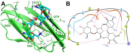 Another interesting FDA-approved drug selected by the mentioned computational protocol is represented by ZINC000060183170 (paromomycin). Figure 5 illustrates the molecular docking outputs, highlighting the main contacts that this drug can establish with the surface of the irisin monomer (Figure 5A). In particular, the considered compound can strongly target the key residues involved in the dimerization process and, in particular, could form H bonds with R75, Q78, S86, and W90 (Figure 5B). Furthermore, we observed an important network of polar contacts with E79 (H bonds and salt bridges). Moreover, in this case, the mentioned drug fitted nicely with the surface of the irisin monomer, possibly impeding the correct interactions between irisin monomers.