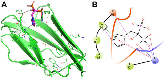 The third interesting drug selected by virtual screening is represented by ZINC000003803652 (zoledronate). This compound was able to target a specific region of the irisin binding site formed by R75, W90, and D91. In particular, ZINC000003803652 can target R75 by an H bond and two salt bridges with the phosphate group, and by a cation–π stacking with the aromatic portion of the drug. Moreover, ZINC000003803652 can establish an H bond with the sidechain of D91, and it could be able to target W90 via an H bond and a π–π stacking. The molecular docking output of ZINC000003803652 within the selected binding site is illustrated in Figure 7 (panels A and B).