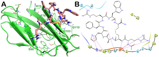 The molecular docking output of the drug with PID 11993702 (setmelanotide) is depicted in Figure 9. Considering the huge size of this drug, it could be able to target several residues of the irisin monomer’s surface (Figure 9A). In fact, through a series of polar and hydrophobic contacts, it could target residues R75 (cation–π stacking), F76 (backbone, H bond), Q78 (H bond), E79 (H bonds, and salt bridges), S86 (H bond), Q103 (H bond), and Q110 (H bond) (Figure 9B). This binding mode allowed the compound to occupy almost the entire surface of the irisin monomer involved in the dimerization process.