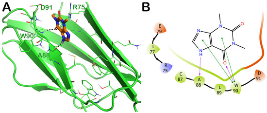 As the last drug with a favorable computational outcome, we identified the compound ZINC000018043251 (theophylline). The molecular docking output is reported in Figure 11. Similarly to the drug zoledronate, we observed a preferred binding to the same region of the surface of the irisin monomer (Figure 11A). The compound ZINC000018043251 was able to target the backbone of A88 via a H bond and could strongly target W90 via a H bond and a double π–π stacking (Figure 11B).