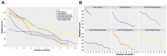 In order to evaluate the influence of the selected drugs on the assembly of irisin monomers, we evaluated the binding energy of the irisin monomers to form the dimers and how the presence of the selected drugs could influence the irisin dimerization in terms of computational scores. For this purpose, we used HADDOCK 2.4, since this software can evaluate the protein–protein binding energy to form the irisin dimer, considering the irisin monomers alone, and it can consider the influence of small molecules bound to the protein monomer in the formation of the dimer. The results of this investigation are reported in Table 4 and Figure 13 (panels A and B). As easily assessable, and as expected, based on the previous computational data, all of the selected drugs could negatively influence the irisin dimerization. In particular, we detected only three clusters for the irisin monomers alone, with small differences in the binding energies and binding modes. Conversely, when a selected drug was considered in the calculation, taking into account the binding mode found by molecular docking calculations, we noted an increase in the uncertainty of the binding mode, retrieving several clusters related to the possible assembly of irisin. Furthermore, the dimer formation energies were increased when a drug was present, indicating a decrease in the affinity of irisin monomers, reflecting the difficult recognition of the monomers. Accordingly, the mentioned data indicated that the selected drugs could preclude the correct recognition of irisin monomers, physically hindering the irisin dimerization. Remarkably, the selected drugs were able to reduce the affinity of irisin for its counterpart by at least 50%, suggesting that the selected FDA-approved drugs could negatively influence the irisin dimerization. Accordingly, they deserve further investigation in this sense.