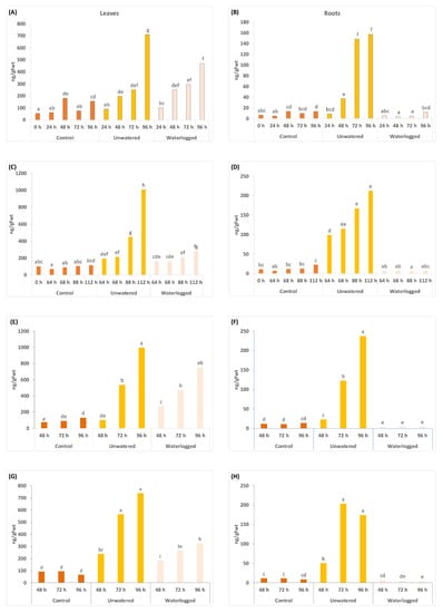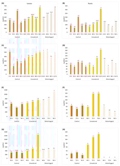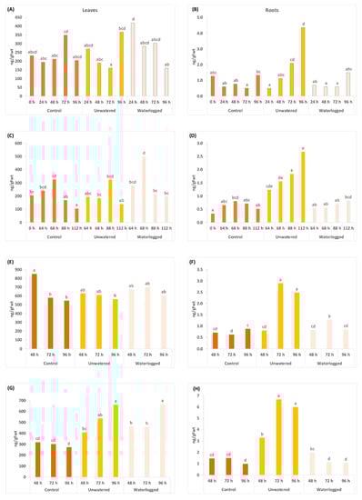 Abscisic acid (ABA) concentrations measured in leaves (left panel) and roots (right panel) at various sample times (in hours, shown in the x-axes) after application of three treatments. From time 0 h, plants in the unwatered treatment were not watered and waterlogged plants were subjected to constant water at quarter pot height. Plants in the control treatment received the standard watering regime of 12 min, twice daily. There were five replicate plants/time/treatment. Two separate experiments were carried out in 2020 on Actinidia chinensis var. chinensis ‘Zesy002’ plants over a 96 h treatment period as shown in (A,B), and 112 h (C,D). In 2021, another two experiments were carried out using an identical setup to compare responses between ‘Zesy002’ (E,F), and A. chinensis var. deliciosa ‘Hayward’ (G,H). Different lettering over the bars indicates statistically significant differences, as shown by Fisher’s Least Significant Difference (LSD), p ≤ 0.05, within each separate experiment and tissue type.