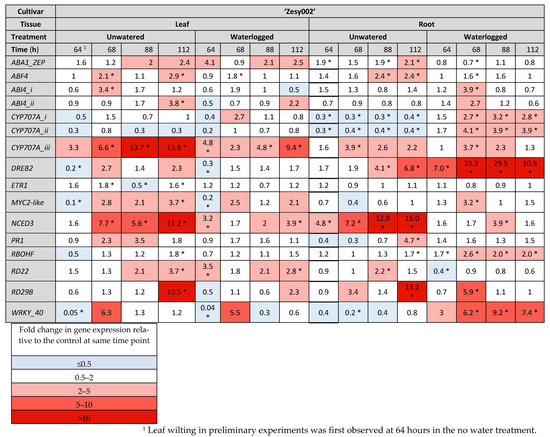 Fold-change in gene expression induced by water stress conditions in leaf and root tissue of Actinidia chinensis var. chinensis ‘Zesy002’ kiwifruit plants after 64 h, 68 h, 88 h and 112 h of water stress treatments in 2020. From time 0 h, plants in the unwatered treatment were not watered and waterlogged plants were subjected to constant water at quarter pot height. Plants in the control treatment received the standard watering regime of 12 min, twice daily. There were five replicate plants/time/treatment. Gene expression was quantified by PlexSet® NanoString using Actin2, Glyceraldehyde 3-phosphate dehydrogenase (GAPDH) and Protein phosphatase 2A (PP2A) as the reference genes. The genes of interest are shown in the left-most column. Statistical analysis was performed at the log2 scale, and the heat map shows fold change data between water stressed plants and the control at the same time point. Fold-change data in red shades (defined in the color panel) indicate an up-regulation relative to the control, whilst blue shades represent down-regulation relative to the control. Fold changes of 0.5–2 are often considered to be statistically unreliable [25,26,27]. Statistically significant differences from the control at individual time points, as determined by ANOVA at (p ≤ 0.05) are identified with an asterisk.