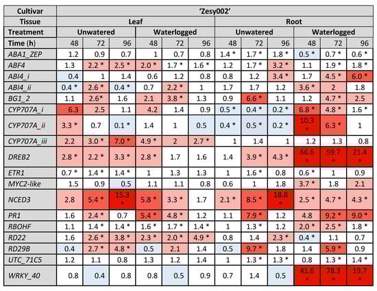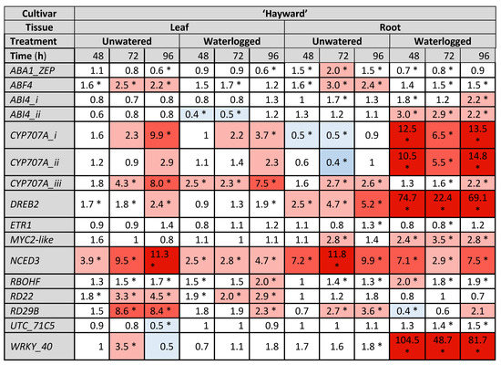 Fold-change in gene expression induced by water stress conditions in leaf and root tissue of Actinidia chinensis var. chinensis ‘Zesy002’ kiwifruit plants after 24 h, 48 h, 72 h and 96 h of water stress treatments in 2021. Plants in the unwatered treatment did not receive any watering from time 0 h, while waterlogged plants were subjected to constant water at quarter pot height. Plants in the control treatment received the standard watering regime of 12 min, twice daily. There were five replicate plants/time/treatment. Gene expression was quantified by PlexSet® NanoString using Actin2, Glyceraldehyde 3-phosphate dehydrogenase (GAPDH), Protein phosphatase 2A (PP2A) and ubiquitin-conjugating enzyme (UBC) as the reference genes. The genes of interest are shown in the left-most column. Statistical analysis was performed at the log2 scale, and the heat map shows fold change data between water stressed plants and the control at the same time point. Red shades (as defined in Figure 2) indicate an up-regulation relative to the control, whilst blue represents down-regulation relative to the control. Fold changes of 0.5–2 are often considered to be statistically unreliable [25,26,27]. Statistically significant differences from the control at individual time points, as determined by ANOVA at (p ≤ 0.05) are identified with an asterisk.