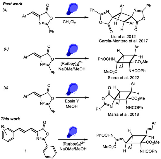 Closely related to the truxillic and truxinic acids are the unnatural bis-amino acids 1,3-diaminotruxillic and 1,2-diaminotruxinic derivatives (Figure 1b), which also show antinociceptive activity, and, moreover, are promising substrates in the treatment of diabetes type-II because they are the only non-peptidic agonists of the Glucagon Like-Peptide-1 (GLP-1) receptor [26,27,28]. The basic scaffold of 1,3-diaminotruxillic and 1,2-diaminotruxinic amino acids is a cyclobutane; therefore, the simplest synthetic approximation for their preparation could be the [2+2]-photocycloaddition of two olefins [29], more specifically, two 4-aryliden-5(4H)-oxazolones (Figure 1b). Despite its apparent simplicity, this synthetic method has been scarcely investigated, and, as far as we know, only four reports have appeared in the literature (Figure 2).