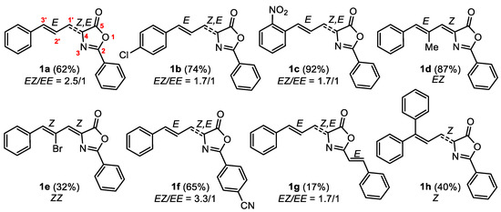 However, analysis of the NMR data in toluene-d8 of 1a–1c (Figures S1–S16) and 1f–1g (Figures S31–S45) showed the presence of a mixture of two isomers in 3.3/1 to 1.7/1 molar ratios, depending on the oxazolone. Two sets of signals assigned to the protons of the -C3’(H)=C2’(H)-C1’(H)=C4 fragment were observed, with 3JH3’H2’ values identical in the two isomers (15.7 Hz), suggesting an E configuration of the C3’=C2’ double bond in both isomers. As expected, the large 3JH1’H2’ value (11.6 Hz) suggests the formation of the s-trans rotamer of the diene system. Thus, the source of isomerism in these oxazolones must be located in the relative disposition of the oxazolone ring with respect to the C1’=C4 bond. The proton-coupled 13C NMR spectrum of 1a showed the presence of two doublet peaks assigned to the CO group. The major species showed a value of the coupling constant 3JCH = 4.2 Hz. According to previous reports [42,43], this suggests that the C1’=C4 bond has a Z-configuration; therefore, the major isomer of the oxazolone is EZ. As expected, in the minor isomer, this value was 3JCH = 11.6 Hz, suggesting an E-configuration for this bond and that the oxazolone is EE.