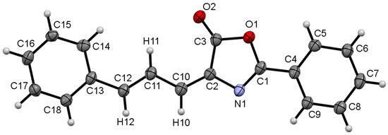 The structure shows that the two C=C double bonds (C2-C10 and C11-C12) are trans, thus corresponding to the minor EE-isomer. The allylidene fragment C13-C12-C11-C10-C2 shows the expected long-short-long-short pattern of bond distances, corresponding to a C-C=C-C=C- molecular skeleton. Despite this pattern, the individual values of the bond distances show electronic delocalization throughout this system, as both the long bond distances (C12-C13 = 1.455(4) Å and C10-C11 = 1.427(4) Å), as well as the short ones (C11-C12 = 1.358(4) Å and C2-C10 = 1.361(4) Å) are in the respective range of distances found in the literature for this type of conjugated bonds [44]. Other internal parameters of the oxazolone and Ph rings do not show deviations with respect to similar compounds found in the literature [45,46,47,48].