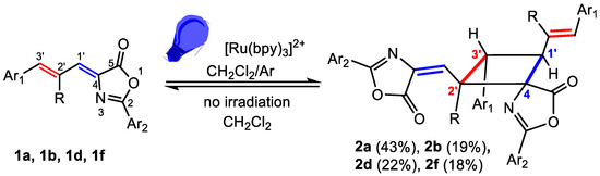 The irradiation of oxazolones 1a–1h in CD2Cl2 at room temperature with the blue light provided by a Kessil lamp (456 nm) was monitored by 1H NMR and showed the appearance of many peaks in the 4–6 ppm region. This fact suggests the formation of the expected cyclobutanes, but the large number of peaks observed suggests the formation of many isomers and that the reaction takes place without selectivity. We previously observed that the introduction of a photosensitizer improved the selectivity of the reaction [32]. In this respect, the irradiation of oxazolones 1a, 1b, 1d, and 1f with blue light (456 nm, Kessil lamp) in deoxygenated CD2Cl2 at room temperature, under Ar atmosphere and in the presence of [Ru(bpy)3](BF4)2 (5% mol), took place with complete conversion of the oxazolone 1 in 18 h and formation of the corresponding cyclobutanes 2a, 2b, 2d and 2f (Figure 5). The characterization of these cyclobutanes by NMR spectroscopy (Figures S46–S66) showed that each one was formed by a mixture of two isomers, one of them clearly as a major species with respect to the other (molar ratio 10.1/1 for 2a, 3.6/1 for 2b, 2.9/1 for 2d, 4.8/1 for 2f). For 2a and 2f this mixture could be separated by flash column chromatography. The structure determined from NMR data for isolated 2a and 2f is shown in Figure 5. For 2b and 2d, the mixture could not be separated, and the structure represented in Figure 5 was assigned to the major isomer. The structure of the minor isomers could not be determined due to their low molar ratio.