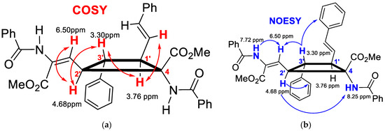 The characterization of compounds 2 and 3 was carried out on the basis of their MS and NMR data (Figures S46–S80). The ESI+ spectra of 2 and 3 showed perfect agreement with the structures shown in Figure 5 and Figure 6. The analysis of the NMR spectra of 2 (Figures S46–S66) enabled inference of the cyclobutane scaffold, but the absence of significative NOE cross-peaks precluded knowledge of the spatial distribution of the cyclobutane substituents, and hence, their full structural characterization. Fortunately, the NMR data of 3a and 3b (Figures S67–S80 of Supplementary Materials) allowed an unambiguous structural determination, showing that photodimerization occurred between the exocyclic C1’=C4 bond attached to the oxazolone ring of one molecule and the styryl C3’=C2’ bond of the other molecule (Figure 5 and Figure 6). The simultaneous presence in the NMR spectra of signals due to the vinyl oxazolone proton (C1’(H)=C) and the styryl fragment (Ar-C3’(H)=C2’(H)-) supports this hypothesis. The 1H COSY spectrum of 3a (Figure S71) showed a clear correlation between the vinylic protons and the peak at 3.76 ppm, which was then assigned to H-C1’. The COSY spectrum of 3a also showed a correlation between the proton at 3.30 ppm with those appearing at 3.76 ppm and 4.68 ppm, but no correlation was observed between the latter, showing that the signal at 3.30 ppm was due to the H at C3’. The multiplicity of the signals due to the three chemically inequivalent protons at C1’, C2’ and C3’ showed that only head-to-head coupling was possible. In turn, the peak at 4.68 ppm (H at C2’) correlated with the peak at 6.50 ppm, which was then assigned to the proton at the N-C=CH group. This structural information of 3a is presented in Figure 7a, and similar conclusions can be obtained from the analysis of the 1H COSY of 3b.