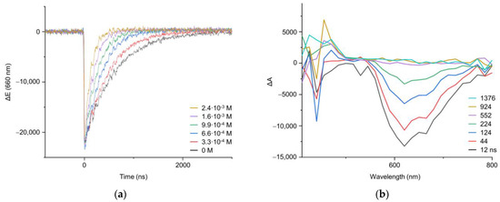 (a) Decay traces recorded at 660 nm for [Ru(bpy)3]2+ (in deoxygenated CH2Cl2) after addition of different amounts of 1a, obtained after LFP excitation at 532 nm; (b) Transient absorption spectrum of a deoxygenated CH2Cl2 solution of [Ru(bpy)3]2+ in the presence of 1a (2.4 · 10−3 M) registered at different times after laser pulse (λexc = 532 nm).