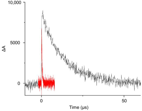 Moreover, the measurement of the transient absorption spectra of deoxygenated solutions of [Ru(bpy)3]2+ in CH2Cl2 and in the presence of oxazolones 1 at different times after the laser pulse enabled visualization of the formation of a new transient species. This is shown in Figure 8b, where it is clear that the spectrum of the triplet excited state 3[Ru(bpy)32+]* vanished with time, and a new species with an absorption band at 450 nm emerged and disappeared in a few microseconds. At a short interval after the pulse (12 or 44 ns, black or red lines, respectively) the main species was the triplet of the Ru, while at long intervals (552 or 924 ns, grey and ochre lines), the triplet of the Ru had almost disappeared due to energy transfer to the oxazolone and the subsequent formation of a transient species, which was visible in the emerging absorption at 450 nm. Our proposal is that this transient species is the oxazolone excited state, which appears as the photosensitizer disappears. Figure 9 shows the decay curve (black line) measured at 470 nm of the new species detected in deoxygenated solutions by the reaction of 1a with 3[Ru(bpy)32+]*. The half-life of this intermediate, determined from the exponential decay, was 12.15 μs in deoxygenated solution. Both the half-life of this intermediate, in the scale of microseconds, as well as the fast deactivation of this species in the presence of O2 (red line in Figure 9; a value of 1 × 109 M−1s−1 was determined for the deactivation rate constant) points to the triplet nature of this excited state. A similar value for the half-life was measured for 1b (10.72 μs), while for 1d, the value was shorter (726.1 ns), although this still suggests a triplet nature of the excited state. From all these data, we can conclude that the ruthenium species behaves as a photosensitizer of the oxazolones 1, whose reactive state 3[oxa-1]* is a triplet excited state generated, presumably, by an energy transfer process from 3[Ru(bpy)32+]* to the oxazolone oxa-1, as shown in Figure 10. Due to the importance of the correct characterization of the reactive species, it was further studied using DFT methods.
