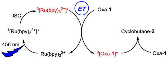 Proposed mechanism for the formation of the reactive species of the oxazolone 3[oxa-1]* by photosensitization of the oxazolone in the ground state oxa-1 from 3[Ru(bpy)32+]* by energy transfer. Further reaction of 3[oxa-1]* with oxa-1 affords the cyclobutanes 2.