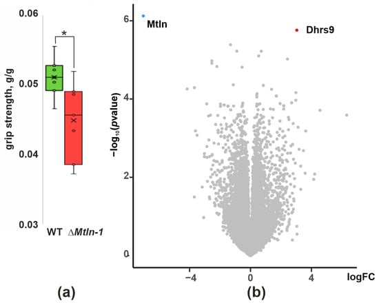 Influence of Mtln inactivation on integrative characteristics of muscle. (a) Forelimb grip strength of the wild type (green bar, n = 10) and ΔMtln-1 (red bar, n = 13) male mice after 24 h food deprivation; interquartile ranges are shown as solid bars, while the all-data range is shown by thin lines. The horizontal line corresponds to the median, while the cross to the average. The significance level calculated using the Student’s t-test is shown; If a p-value is less than 0.05, it is flagged with one star (*) (b) Differential gene expression in the soleus muscle of the wild type and ΔMtln-1 knockout mice. Volcano plot of differentially expressed genes. The x-axis corresponds to the log-scale fold change of expression, ΔMtln-1 relative to the wild type, while the y-axis corresponds to p-value.