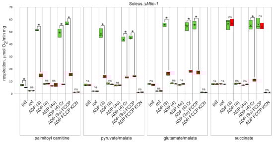 Influence of Mtln gene inactivation on respiration of muscle mitochondria. Oxygen consumption rate (OCR) of soleus muscle mitochondria extracted from the wild type (green bars, n = 3) and ΔMtln-1 (red bars, n = 3) male mice. The groups of bars correspond to the respiration on palmitoyl carnitine (CI + CII + ETF activity), pyruvate and malate (CI activity), glutamate and malate (CI activity) and succinate (CII activity) as marked below the graphs. The experimental points measured are substrates alone (init), substrates with rotenone (rot), substrates and ADP (ADP (3)), substrates after exhaustion of ADP (ADP (4)), substrates after exhaustion of ADP after addition of oligomycin (ADP (4o)), substrates after exhaustion of ADP (ADP (4)) following addition of creatine, substrates after exhaustion of ADP after addition of oligomycin and FCCP uncoupler (ADP (3u) FCCP), residual respiration after inhibition of uncoupled respiration by potassium cyanide. Interquartile ranges are shown as solid bars, while the all-data range is shown by thin lines. The horizontal line corresponds to the median, while the cross is the average. The significance level calculated using the Student’s t-test is shown. If a p-value is less than 0.05, it is flagged with one star (*).