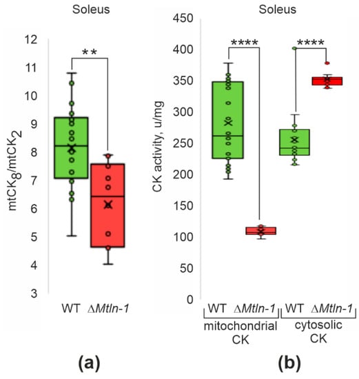 Influence of Mtln gene inactivation on creatine kinase functioning. (a) Relative abundance of the octameric and dimeric forms of the mitochondrial creatine kinase (mtCK) in the soleus muscle mitochondrial extracts of the wild type (green bars, n = 18) and ΔMtln-1 (red bars, n = 10) male mice; (b) Mitochondrial (left group of bars) and cytosolic (right group of bars) creatine kinase activity for the soleus extracts of the wild type (green bars, n = 18) and ΔMtln-1 (red bars, n = 10) male mice. For all panels, interquartile ranges are shown as solid bars, while the all-data range is shown by thin lines. The horizontal line corresponds to the median, while the cross is the average. Significance level calculated using the Student’s t-test is shown. If a p-value is less than 0.01, it is flagged with two stars (**), while four stars (****) corresponds to a p-value less than 10−4.