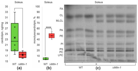 Earlier we demonstrated [] that an influence of Mtln on the respiratory Complex I is indirect and likely to be mediated via modulation of lipid composition. Cardiolipin (CL) is the most specific lipid of the mitochondrial inner membrane needed to maintain cristae structure as well as an optimal functioning of a set of enzymatic complexes embedded as well as associated with the mitochondrial inner membrane, including Complex I [,]. Moreover, Stein and co-authors [] demonstrated a direct interaction of Mtln with CL and the effect of this interaction on the stability of the respiratory chain complexes. Cardiolipin is known to interact with the mitochondrial creatine kinase (mtCK) and facilitate formation of the homooctameric complex of the latter from its homodimers [], which is more prominent for the oxidative muscles []. We set out to test whether Mtln knockout influences cardiolipin concentration in the mitochondria purified from the oxidative (soleus) and glycolytic (tibialis anterior) muscle from the wild type and Mtln knockout mice (Figure 4a, Supplementary Figure S6a,d,f). In both types of muscles and both knockout lines, we revealed a significant drop in the cardiolipin concentration in mitochondria.