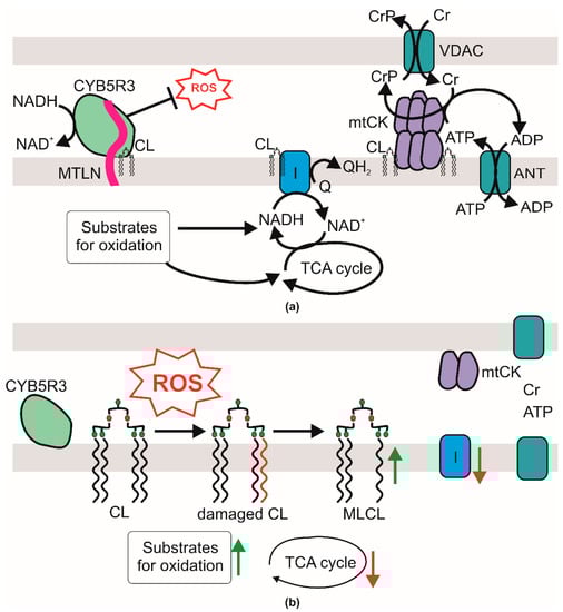 Repair of oxidized cardiolipin by Tafazzin (TFZ) consumes phosphatidyl choline whose concentration decrease we observed earlier []. Apart from the CI, cardiolipin influences mitochondrial creatine kinase []. In line with this, we observed decay of mitochondrial creatine kinase octamer into dimers which leads, in the case of oxidative muscles, to the decrease in the mitochondrial creatine kinase activity and creatine shuttle efficiency, which we assume is a consequence of CL concentration decrease (Figure 5). Previously, such a combination of the observed phenomena has already been noted in mice deficient in creatine kinase in a study where the effect of the absence of the mitochondrial or cytosolic creatine kinase gene or both genes was investigated (reviewed in []). Indeed, contact sites between inner and outer mitochondrial membranes mediated by an octamer of mtCK plays an essential role in cardiolipin transfer between mitochondrial membranes and MAM/ER during lipid maturation and remodeling by the external enzyme ALCAT-1 (Acyl-CoenzymeA:Lysocardiolipin Acyltransferase-1) with specificity to poly-unsaturated acyls []. Disruption of creatine kinase octamers abolishes the trend to increase PUFA-CL and reduces the probability of formation of lipid peroxidation products upon enhanced ROS but also reduction in PUFA-CL leads to decrease in respiration efficacy [].