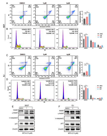 2.2. MTX-211 Induces Apoptosis and Cell Cycle Arrest at GO/G1 Phase in BLCA Cells