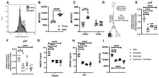 Our initial experiments were designed to examine the level of senescence present in aged lung at baseline. For these experiments, using total lung cells from gently dissociated lung, we investigated β-galactosidase hydryolysis by flow cytometry. When compared to young lung cells, we observed a significant increase in β-galactosidase hydryolysis in aged lung cells (Figure 1A,B). We next evaluated if differences in β-galactosidase hydryolysis were present in immune (CD45+) or non-immune (CD45−) cell populations. We observed a significant increase in β-galactosidase hydryolysis observed in aged CD45+ lung cells when compared to young (Figure 1C). Interestingly, we did not observe differences in β-galactosidase hydryolysis in young and aged unstimulated CD45− lung cells (Figure 1C). Based on efficacy in previous studies, we chose to use senolytics quercetin (Q), dasatinib (D), and quercetin + dasatinib (Q + D) to investigate the impact of treatment on senescence gene expression in the aged lung. For these experiments, we treated aged (20 months) male and female BALB/c mice 3 times weekly for 4 weeks prior to isolation and analysis of lung tissue (Figure 1D). In response to the weekly treatment, there was a significant decrease in p16 gene expression detected in response to Q, D, and Q + D when compared to PBS controls (Figure 1E). In response to Q + D, there was a significant decrease in p21 gene expression quantified in aged lung (Figure 1F). We next evaluated if weekly treatment with senolytics might modulate the expression of damage-associated molecular pattern (DAMP) molecules, such as high mobility group box protein 1 (HMGB1). Plasma was isolated from PBS and senolytic treated mice and HMGB1 levels were assessed. When compared to PBS controls, weekly treatment with Q, D, and Q + D resulted in a decrease in HMGB1 detected in plasma and BAL (Figure 1G,H). We next investigated if senolytic treatment impacted senescence in aged lung. In response to weekly treatment, we observed a significant decrease in β-galactosidase hydryolysis occurred in senolytic-treated mice when compared to PBS controls (Figure 1I).