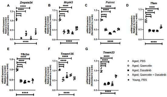 Treatment of Aged Mice with Senolytics Alters Senescence Gene Expression in Aged Lung. Lung tissue was collected from PBS-, quercetin-, dasatinib-, and quercetin + dasatinib-treated aged adult BALB/c mice (20 months of age). Expressions of (A) Zmpste24, (B) Mrpl43, (C) Polrmt, (D) Tfam, (E) Tfb2m, (F) Tmem135, and (G) Tmem33 were assessed by real-time PCR. N = 6 mice per group, and the experiment was repeated 3 times. Young (3 months) PBS-treated lung expression analysis is included for comparison **** p < 0.0001.